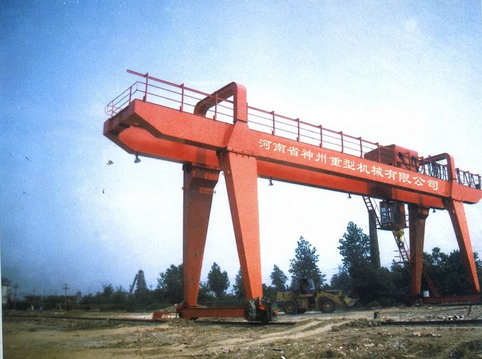 路橋門式起重機(jī)其主要用于橋梁建設(shè),工作速度慢,由門架、卷揚(yáng)機(jī)小車、大車運(yùn)行機(jī)構(gòu)、司機(jī)室和電氣控制系統(tǒng)組成。門架為桁架結(jié)構(gòu),具有結(jié)構(gòu)輕、抗風(fēng)力強(qiáng)等 優(yōu)點(diǎn)。包括主梁、上端梁、支腿、下端梁、走行臺車及走臺欄桿等。主梁采用三角桁架結(jié)構(gòu),上面鋪設(shè)有軌道,供小車沿主梁方向作橫向移動。支腿采用箱形或鋼管 兩種形式。小車上布置有卷揚(yáng)機(jī),體積緊湊,自重輕。大車運(yùn)行采用擺線針輪減速器,軟啟動電機(jī),八輪四驅(qū)動,運(yùn)行平穩(wěn)。操作方式采用閉式司機(jī)室,內(nèi)有可調(diào)式 座椅,底板鋪設(shè)絕緣墊,窗玻璃采用鋼化玻璃,配有滅火器、電風(fēng)扇,可根據(jù)用戶要求配置冷暖空調(diào)、訊響器、對講機(jī)等物品。