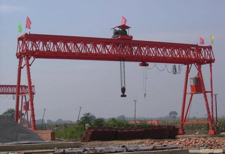 路橋門式起重機(jī)其主要用于橋梁建設(shè),工作速度慢,由門架、卷揚(yáng)機(jī)小車、大車運(yùn)行機(jī)構(gòu)、司機(jī)室和電氣控制系統(tǒng)組成。門架為桁架結(jié)構(gòu),具有結(jié)構(gòu)輕、抗風(fēng)力強(qiáng)等 優(yōu)點(diǎn)。包括主梁、上端梁、支腿、下端梁、走行臺車及走臺欄桿等。主梁采用三角桁架結(jié)構(gòu),上面鋪設(shè)有軌道,供小車沿主梁方向作橫向移動。支腿采用箱形或鋼管 兩種形式。小車上布置有卷揚(yáng)機(jī),體積緊湊,自重輕。大車運(yùn)行采用擺線針輪減速器,軟啟動電機(jī),八輪四驅(qū)動,運(yùn)行平穩(wěn)。操作方式采用閉式司機(jī)室,內(nèi)有可調(diào)式 座椅,底板鋪設(shè)絕緣墊,窗玻璃采用鋼化玻璃,配有滅火器、電風(fēng)扇,可根據(jù)用戶要求配置冷暖空調(diào)、訊響器、對講機(jī)等物品。